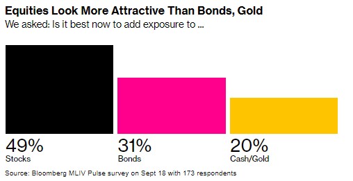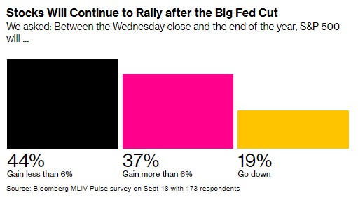 美联储自 2020 年以来首次降息,市场对美国经济软着陆的预期上升,预计股市将上涨。调查显示,44% 的受访者认为标普 500 指数涨幅不超过 6%,19% 预期下跌。尽管鲍威尔对经济持乐观态度,市场对未来股市上涨仍持谨慎态度。57% 受访者认为价值股将超越大盘表现,49% 认为当前是增持股票的好时机。