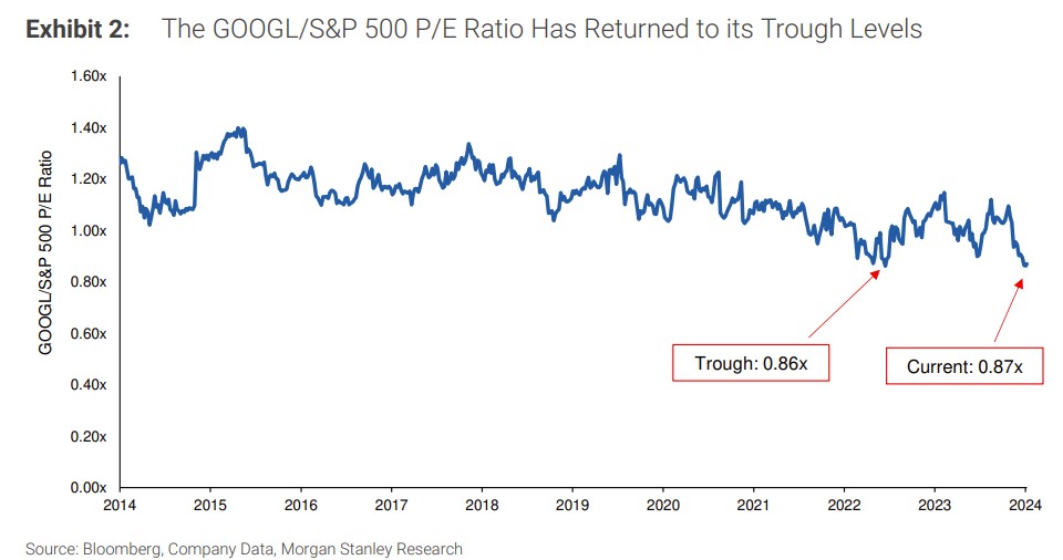 目前,谷歌相对于标普 500 的估值倍数约为 0.87 倍,为十年来低点,而长期平均水平为 1.1 倍。