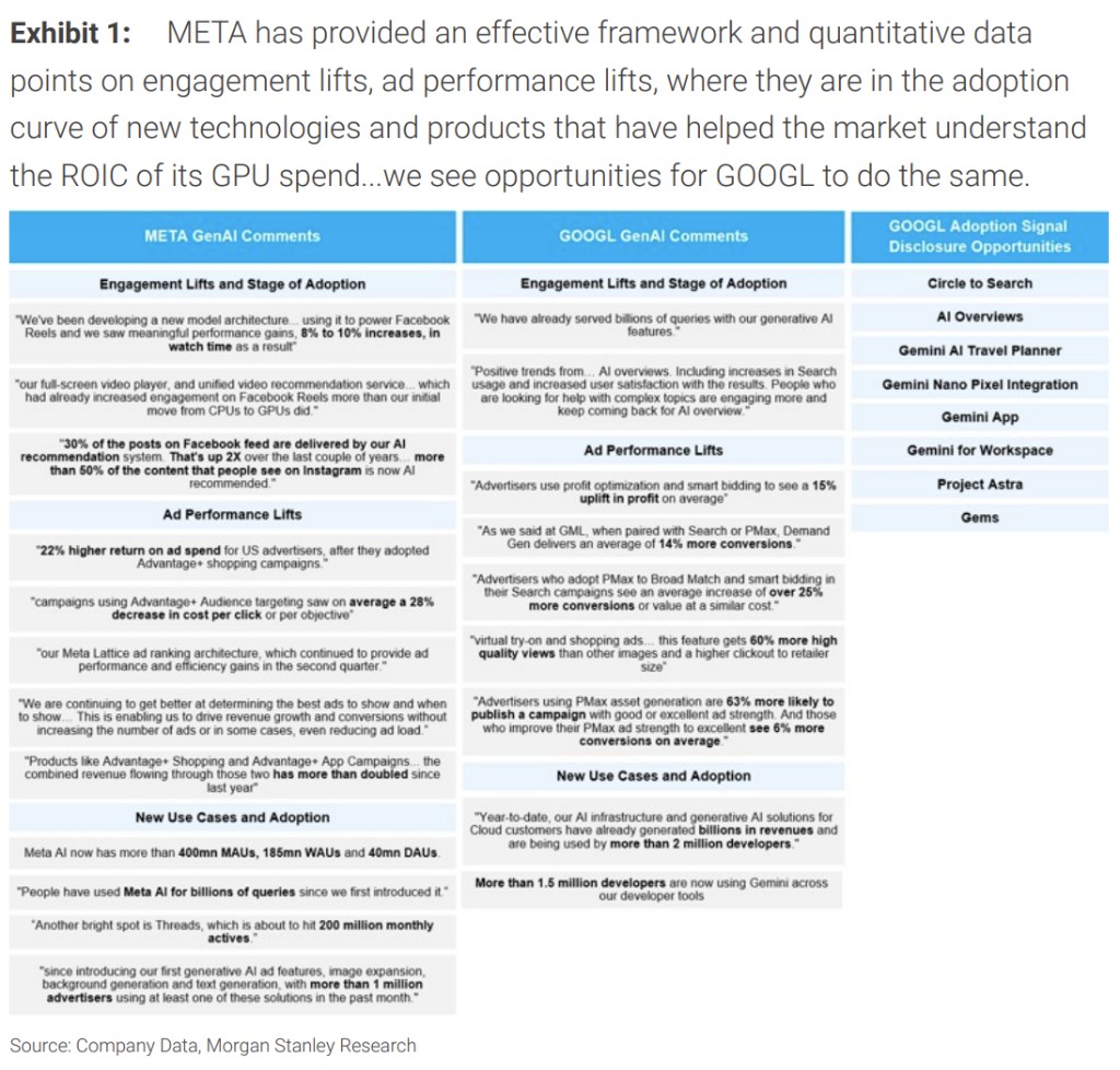 大摩认为,在这个领域的执行力和披露水平是谷歌估值倍数扩张的最大机会之一,也是投资者更好理解资本支出回报率的一个机会。