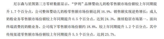虽然,伊利这一业务分类包括了成人奶粉及奶酪等干乳制品。但婴儿奶粉这一块业务,增速不会比 7.31% 低,飞鹤也许提升了市场份额,但伊利提升了更多。