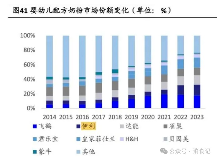 两者现在都是在共同取代原来其他品牌的市场,但飞鹤的市占率提升速度一直比不过伊利,长期来看,这也是对于飞鹤的市占率提升不乐观的点,伊利的市占率快速提升,跟飞鹤的市占率扩张降速,是同步的。