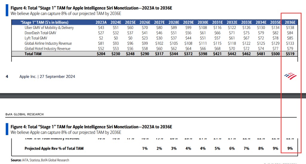美银预计,Siri 整合将从 2026 年开始为苹果公司带来约 30 亿美元的潜在收入,并且这一收入可能在未来十年接近 500 亿美元。