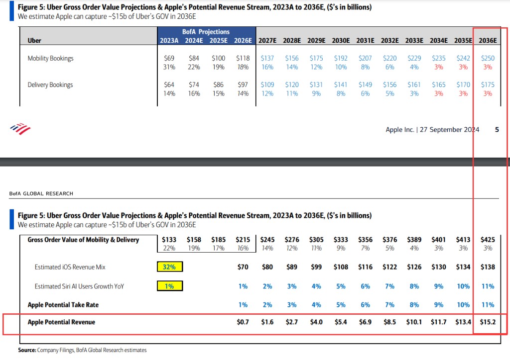 比如该行预计,通过提供整合服务,到 2036 年,苹果可以从 Uber 的总订单价值中获得约 150 亿美元。