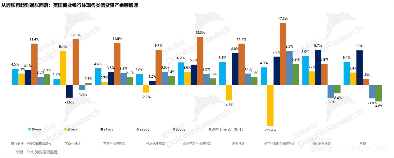 大家知道,在美联储这轮加息过程中,反复会有声音说,通胀是因供应链、俄乌战争和疫情扰动而起,也因这个因素的结束而回落,再加上低利率敏感性的美国财政举债,美联储加息的效果非常有限。比如说整个 2023 年美国商业银行体系的贷款余额名义增速只有 2%,并没有妨碍当年全年 GDP 3% 的实际增长。