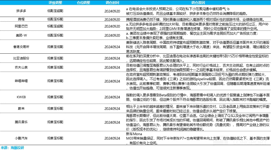 基于海豚君上次策略周报《直降 50 基点,美联储才是多美股的终极大佬?》所阐述的逻辑,在美联储降息之后,国内政策空间打开,海豚君先加仓了一些相对优质的中概资产,并在三大金融部门会议政策超预期之后,进一步调入基本面有变化改善的次优质中概资产。