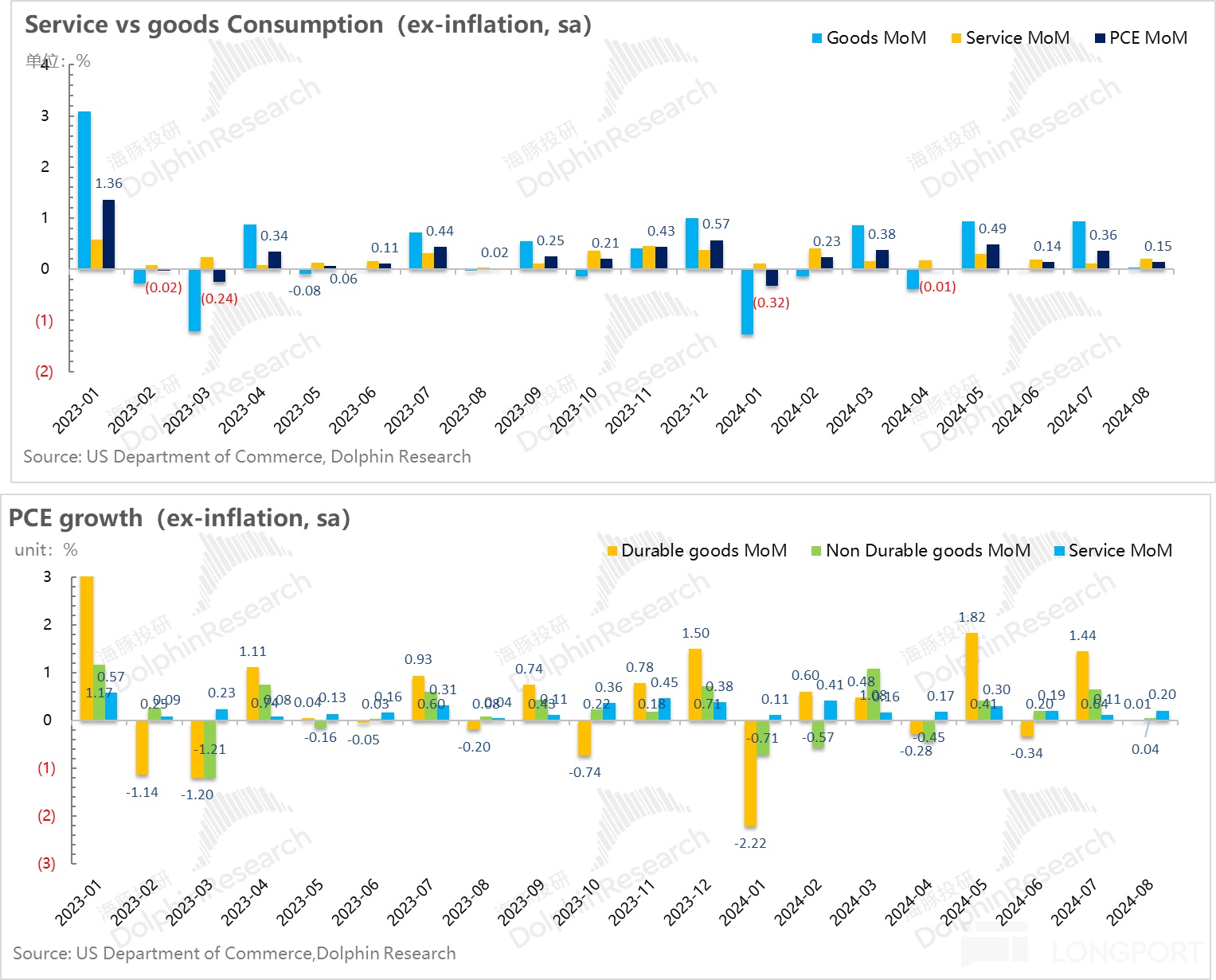 通胀持续走弱的同时,8 月的消费又明显走弱:8 月剔通胀后的居民消费支出环比增长仅 0.15%,服务消费环比 0.2% 还算偏稳的情况下,商品消费走弱明显,耐用商品环比几乎零增长,不过这里一定程度和之前一个月走高有关。
