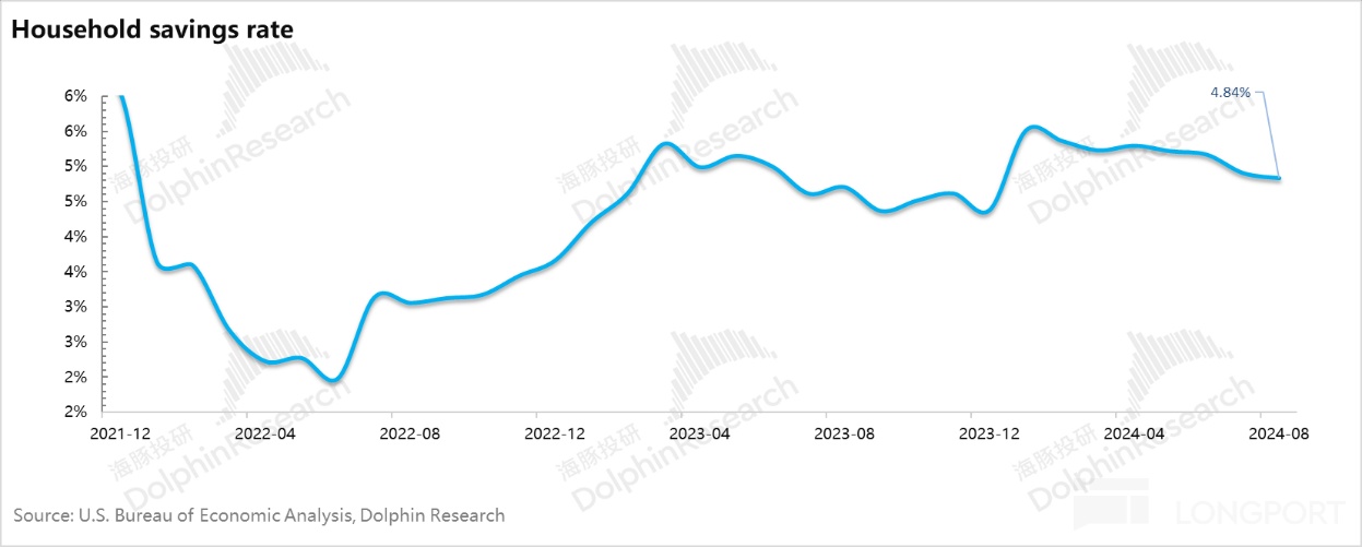 8 月消费环比回落主要是因为消费对储蓄的挤压没有像 7 月那么夸张了。这个周期内,因为这段时间美国人在良好资产负债表 + 工作不愁带来的安全感下,一直在挤压储蓄率来消费,这导致居民消费的增长一直高于居民收入的增长,7 月份尤其如此。