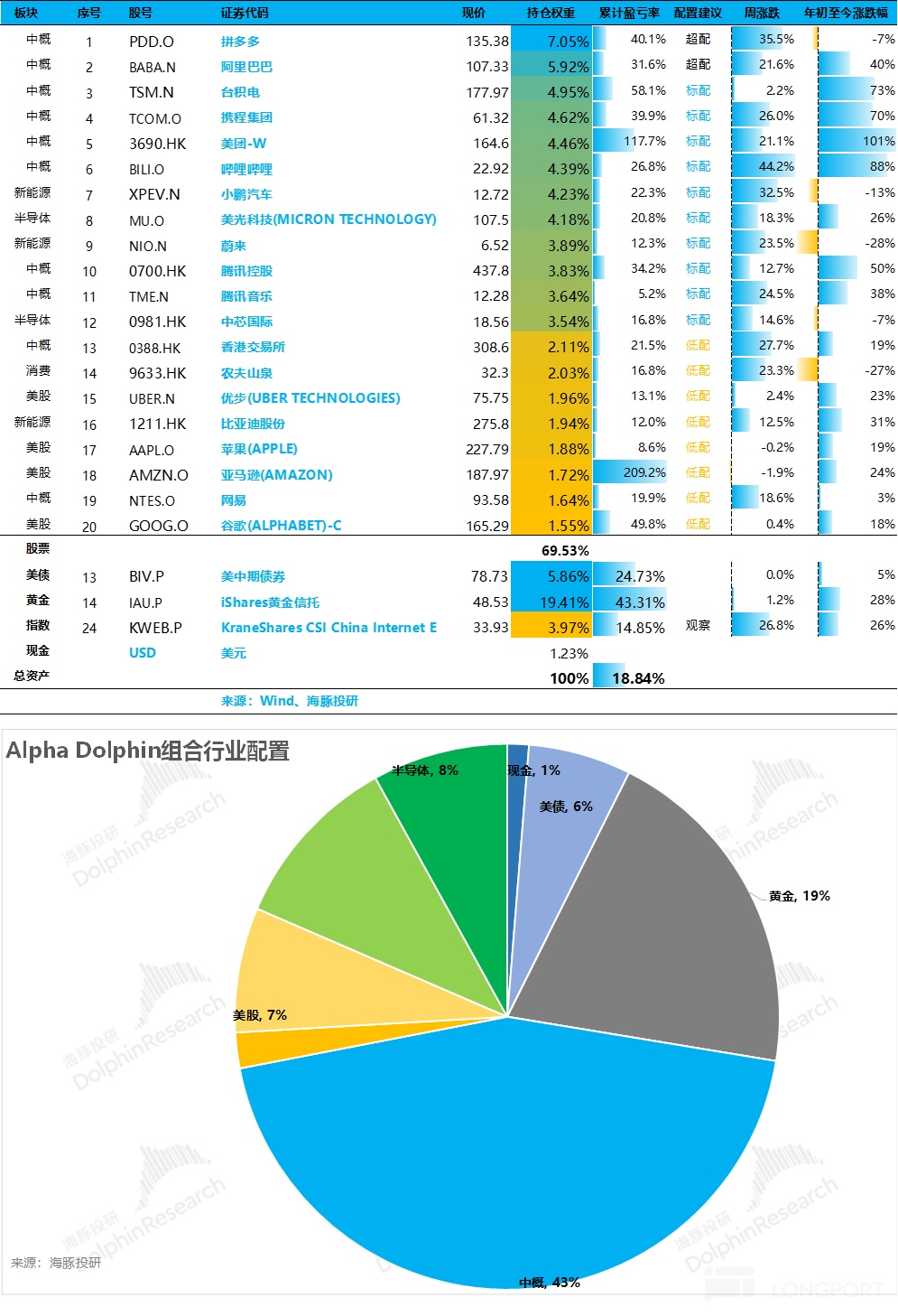 Alpha Dolphin 虚拟组合共计持仓 13 只个股与权益型 ETF,其中标配 5 只,8 只权益资产为低配。其余分布在了黄金、美债和美元现金上,目前现金与类现金仍然较多,近期考虑加仓。截至上周末,Alpha Dolphin 资产配置分配和权益资产持仓权重如下: