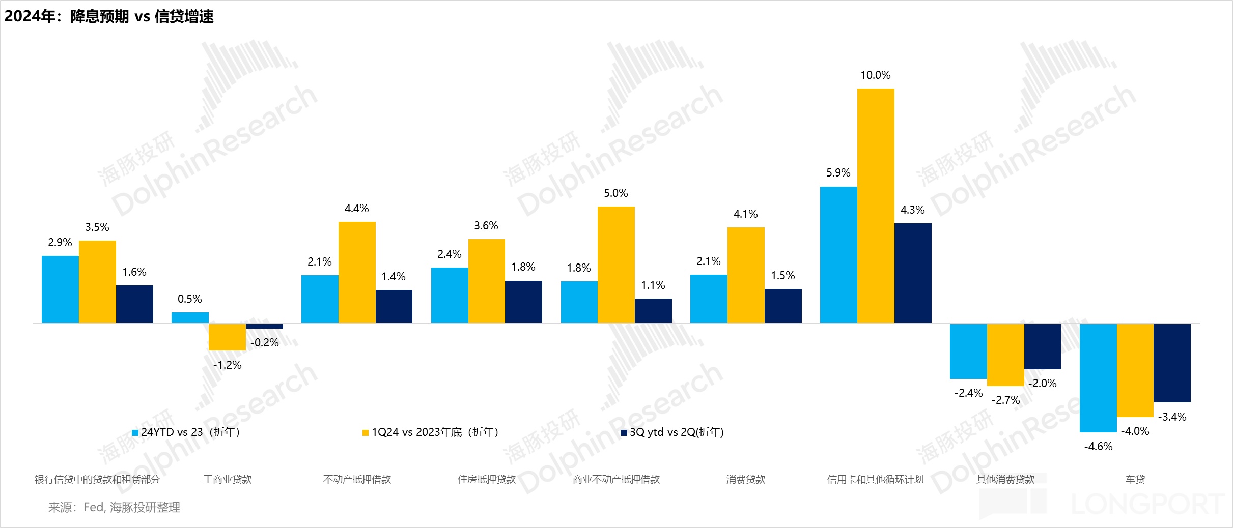 (海豚君批注:估计这里的意思是,由于利率太高,这次在降息的上半段,降息的更多作用是降低过去两年加息周期内新增贷款多的部门的付息压力,比如美联邦财政,另外是降息浮息贷款的付息压力。但整体上,上半程利率还是很高,很难刺激有效的信贷需求。)