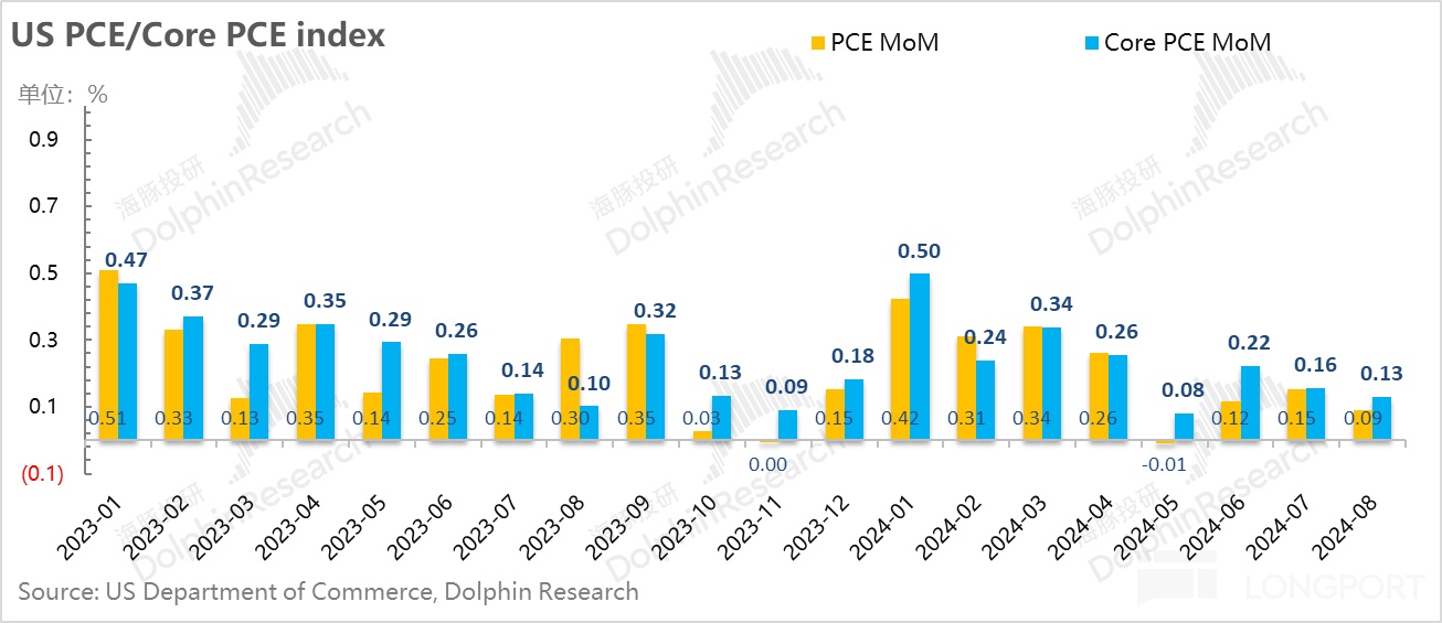 8 月美国核心 PCE 环比增长也就 0.13%,基本是在 2% 通胀时代大约月波动 0.1%-0.2% 的正常范围内。如果再加上能源、食品的整体 PCE 环比更是掉到了只有 0.09%。
