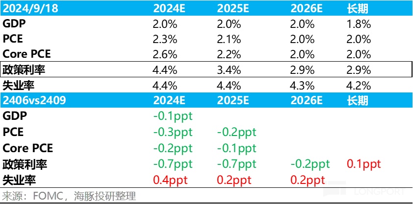 目前美联储给出的指引是,2024 年再降息 50 个基点,今年降 100 个基点,明年再降 100 个基点,后年降 50 个基点,以后的长期名义利率靠近 3% 的附近。