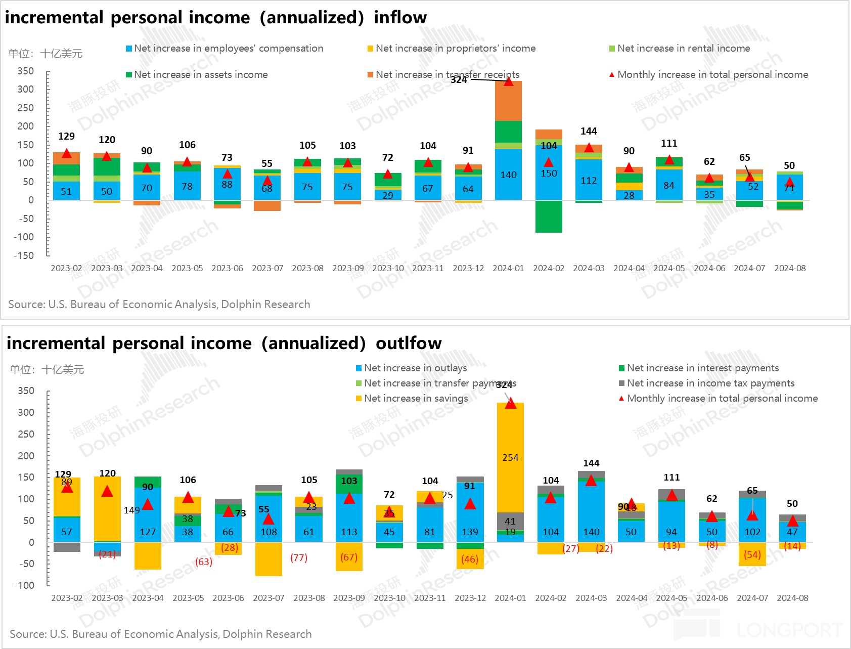 那么,总体消费的增长放缓的源头,到底是储蓄率提高了,还是因为收入增长放缓了?美国 8 月的居民收支数据来看,美国居民工资赚取能力还是在提高的(说明总就业或者说工资水平并不差),只是资产性收入(比如说分红等)减少,影响了整体收入的增长,但整体收入端问题不大。
