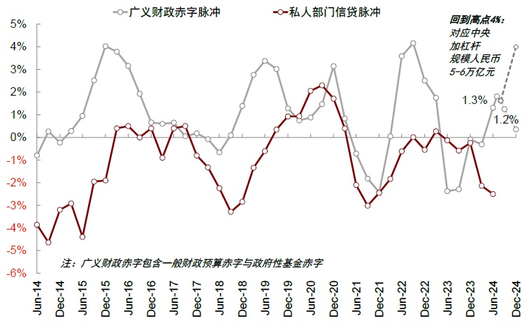 图表:若明年年中广义财政赤字脉冲回到历轮高点(4%),对应广义赤字规模扩张 5-6 万亿元