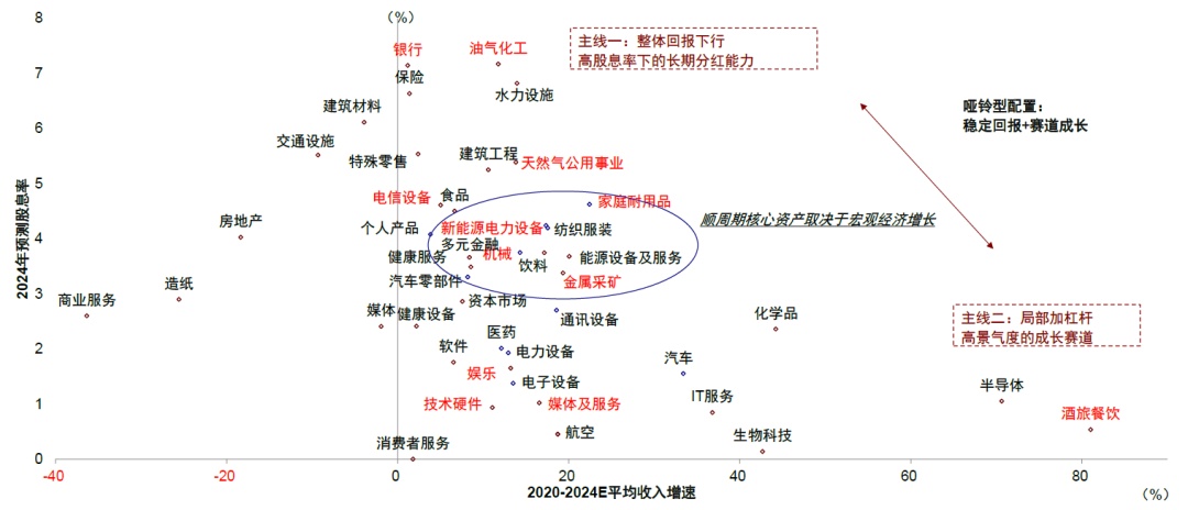 如果政策不断兑现、财政力度超预期,直接受益的顺周期板块有望跑赢,包括消费、地产链和非银行金融等。此外,我们继续建议关注对利率敏感的成长股(互联网、科技成长,生物科技等),港股本地分红和地产、以及受美国地产需求拉动的出口链等。但若财政力度不足或慢于预期,市场可能需要震荡消化。这种情况下,高分红仍有具有长期配置价值,可以借近期回调再择机介入,只不过内部跟随经济环境沿着周期分红、银行分红、防御分红、国债和现金的顺序依次传导。其次,部分政策支持或景气向上板块仍有望受到利好提振而体现出较大弹性,如具有自身行业景气度(互联网、游戏、教培)或者政策支持的科技成长(科技硬件与半导体)。详见原文报告中筛选。