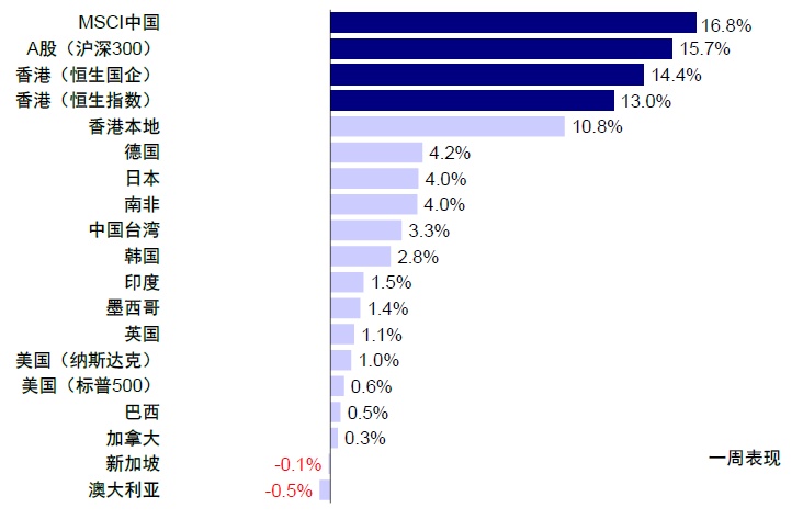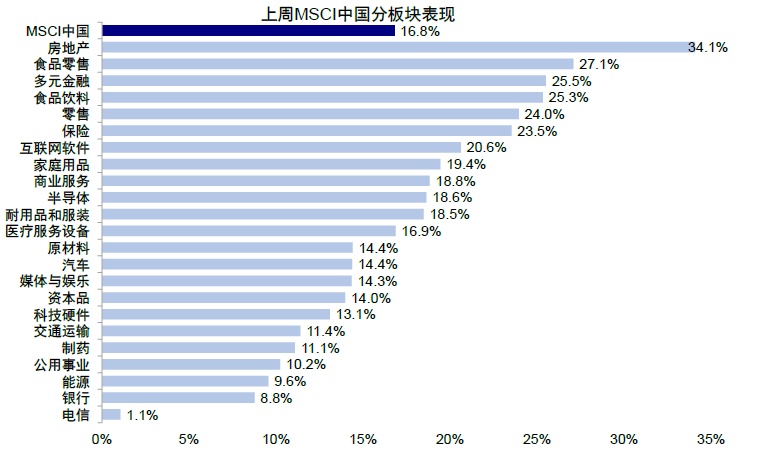 9 月最后一周,金融三部委政策和中央政治局会议超预期提振市场情绪,A 股和港股市场迎来强劲反弹,领涨全球市场。上证指数大涨 12.8%,为 2008 年底以来最大单周涨幅,收复 3,000 点关口;港股市场弹性更大,恒生指数收涨 13.0%,为 2000 年以来最大单周涨幅,重回 20,000 点以上,恒生国企和 MSCI 中国分别上涨 14.4% 和 16.8%,恒生科技更是大涨 20.2%。高涨的情绪推动两地市场成交也创新高,周五港股主板成交额突破 4,000 亿港币,创历史新高,A 股成交额也达到 1.46 万亿人民币,为 2021 年 9 月以来最高。板块层面,直接受益于积极政策预期的房地产(+34.1%)、多元金融(+25.5%)涨幅居前,食品零售(+27.1%)、食品饮料(+25.3%)、零售(+24.0%)、保险(+23.5%)、互联网(+20.6%)也表现不俗,而电信(+1.1%)、银行(+8.8%)、能源(+9.6%)等传统高分红板块落后。