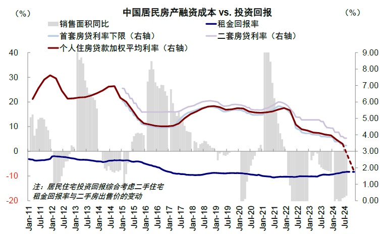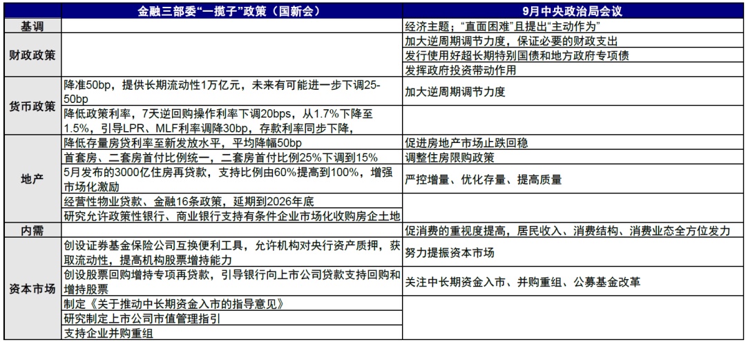 ► 另一方面,着力稳定资产价格与投资回报预期。降息降准政策整体还是延续以前宽松思路,幅度也基本在预期之内,更超预期的增量变化在于稳定资产价格和投资回报预期,体现在政策创新与目标表述:1)央行创设两个新的结构性货币政策工具稳定股市价格,一是证券基金保险公司互换便利工具,鼓励非银金融机构股市投资加杠杆,首期操作规模是 5,000 亿元,后续规模可能追加 5,000-10,000 亿元 [5];二是股票回购增持专项再贷款,并且利率仅为 2.25%,此举相当于央行为股市注入增量资金,首期额度是 3,000 亿元,后续规模同样可追加至 3,000-6,000 亿元 [6]。2)目标性表述明确稳定地产价格,政治局会议首次提出明确目标性表述 “促进房地产市场止跌回稳”,大幅超出市场预期,地产需求端与供给端的接续政策或加速发力;