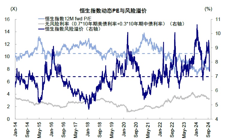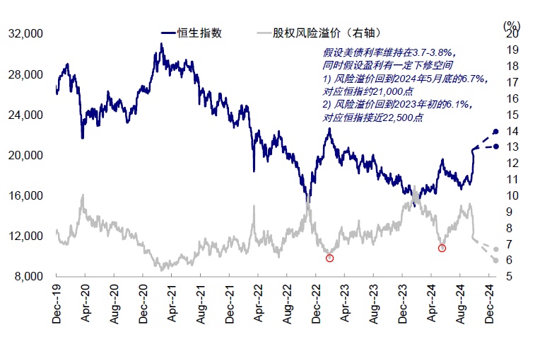 那后续还有多少空间?假设中美无风险利率短期维持不变,同时盈利改善仍待时日:1)如果风险溢价降至 2024 年 5 月市场高点时的 6.7%,或支撑恒指到 21000 点左右;2)如果情绪继续改善至 2023 年初疫情放开后高点对应的 6.1%,恒指或达 22500 点左右。在此基础上,更大的空间则需要财政发力下的盈利修复,当前我们自下而上测算 2024 年全年盈利增长 2-3%,假若盈利增速能修复到 10%,恒指点位或达到 24000 点附近。
