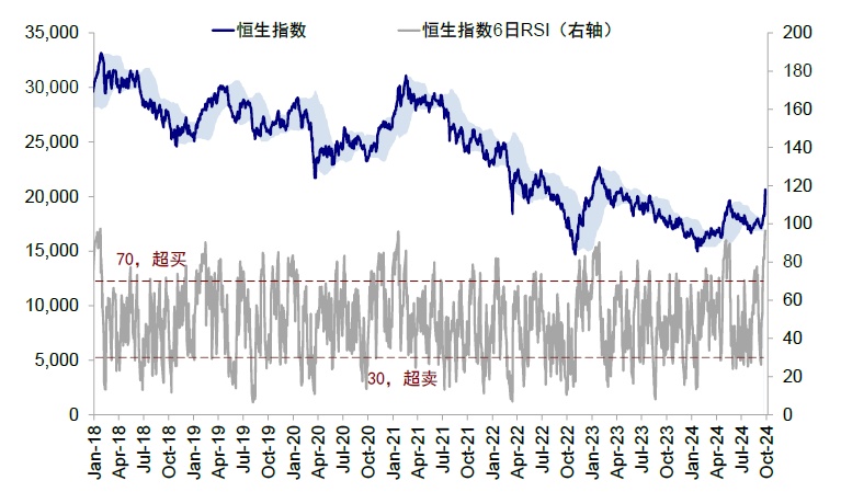 短期市场计入预期较为充分,一方面风险溢价快速回落,另一方面技术指标上也显示短期可能 “超买”:1)当前恒生指数相对强弱指标 6 日 RSI 已达到 96.5,为 2018 年底以来最高,上证指数也达到 94.1,为 2020 年底以来最高。2)反弹中港股卖空成交占比反而抬升,卖空成交规模也持续增加,当前港股卖空占比 5 日平均达 17.5%,较上周的 15.6% 走高。历史上卖空比例与市场往往呈反向走势,同向上行可能表明市场对持续性存在分歧,也说明后续基本面和政策进展对于市场走势的重要性。