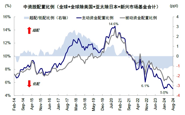 足以见得,长线资金存在滞后性,但也更为关键。当前 EPFR 全球各主要主动基金对中资股的配置比例从 2021 年初 14.6% 的高点降至今年 8 月的 5.0%,较被动资金低配 1 个百分点。我们测算,若从当低配转为标配,有望带来近 400 亿美元流入,相当于 2023 年 3 月以来流出资金的总额。