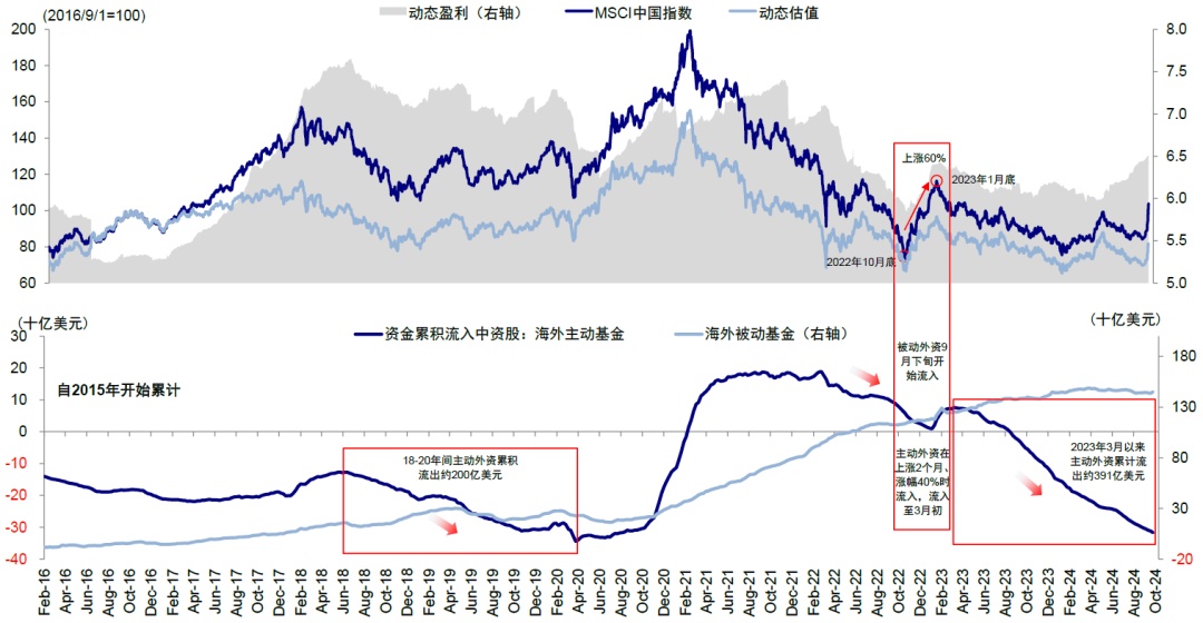 复盘历史经验,交易和被动型资金由于更为灵活,往往都会在反弹初期先行流入,但也存在持续性不强的问题。最典型的如今年 4-5 月大涨中,也是交易型资金快速流入,但 EPFR 主动外资始终未见明显回流,市场也转为震荡。相反,如果基本面修复带动更多主动长线资金回流,那市场空间也会更大。2022 年底,市场 10 月底起连续反弹 3 个月,期间 MSCI 中国大涨接近 60%,被动外资 9 月下旬逐步流入,主动外资则在市场上涨 2 个月即 1 月初、涨幅 40% 后开始流入,一直流入到 3 月初,市场则在 1 月底见顶。