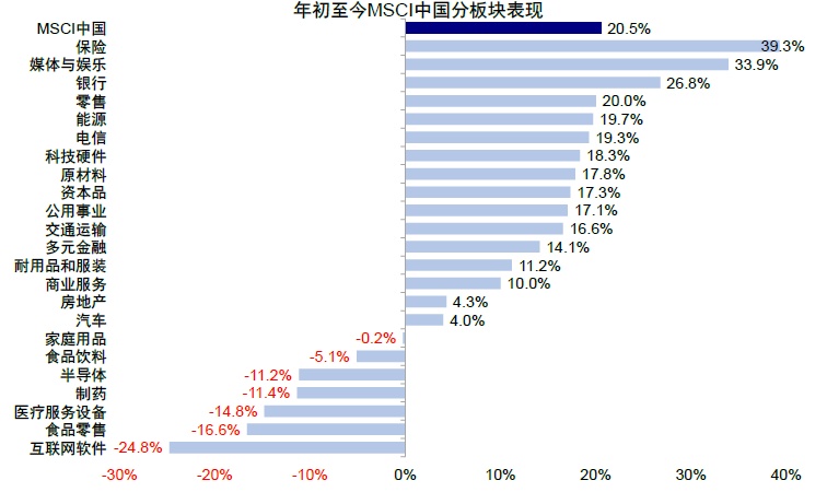 图表:互联网软件、食品零售、医疗服务设备等板块今年以来表现落后