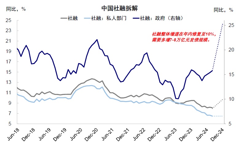 图表:社融增速在年内修复至 10%(23 年年初水平),需要新增 7-8 万亿元发债规模