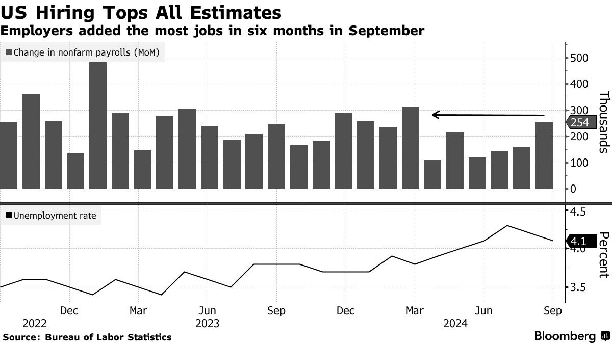 据了解,周五美国政府公布的数据显示,继前两个月超预期上修 7.2 万非农就业人数后,9 月份非农就业人数大幅超预期增加 25.4 万人,创下六个月来最大规模的非农新增人数。相比之下,经济学家们的预期中值仅仅为 15 万人,且最新非农超过媒体调查所显示的最乐观预期。根据美国劳工统计局周五公布的另一项数据,失业率意外降至 4.1%,时薪收入环比超预期增长 0.4%,两项数据均高于经济学家预期 (分别为失业率预期 4.2% 以及时薪增速 0.3%)。