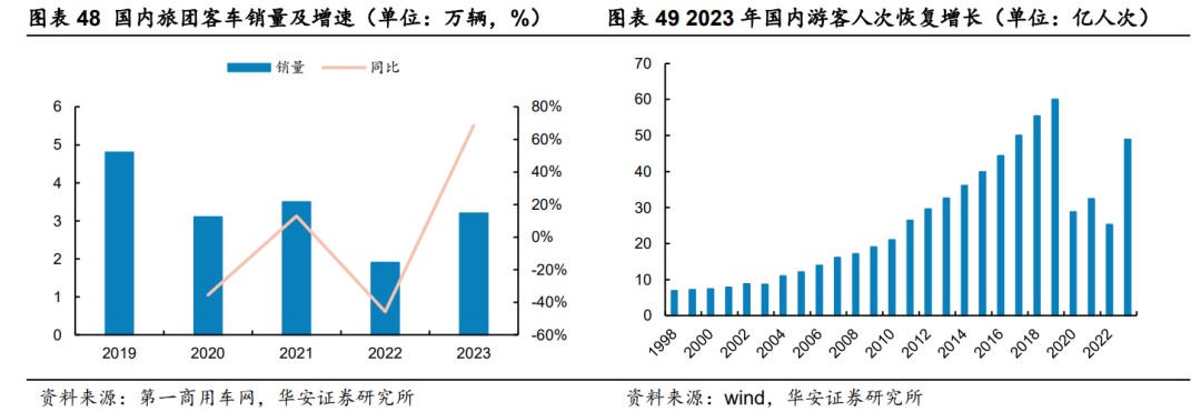 2023 年疫情之后旅游需求快速释放,国内旅游人次恢复到 49 亿,同比增长 93%,预计今年将恢复到疫情前水平。国内旅游需求依旧旺盛带动旅团客车市场持续增长。
