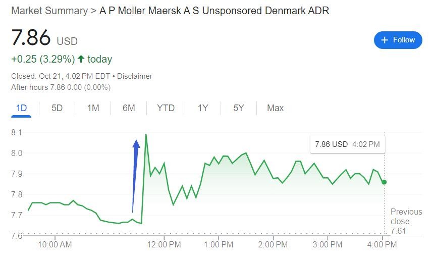 财务数据公布后,周一美股早盘尾声时,马士基美股涨幅迅速扩大并刷新日高,短短五分钟左右,日内涨幅从不足 0.7% 拉升至约 7%,后涨幅迅速收窄,最终收涨约 3.3%。