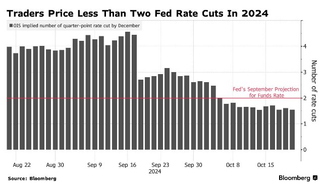 掉期交易员目前预计,美联储将在 11 月的会议上降息 21 个基点,今年最后两次会议的降息幅度为 39 个基点,这增加了美联储在其中一次会议暂停降息的可能性。在美国公布强劲的 9 月就业报告后,这种观点得到了越来越多的支持。