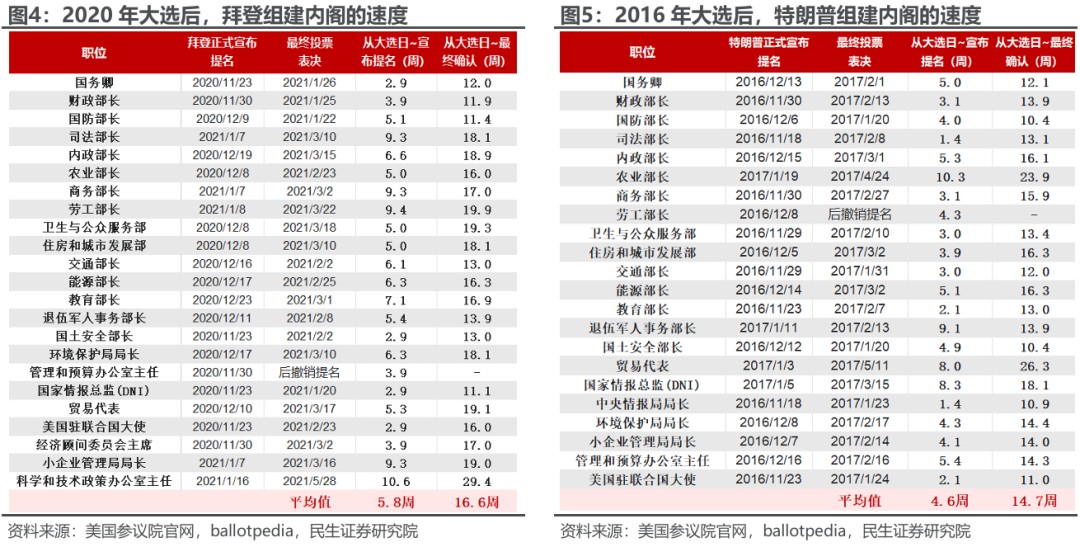 2016 年大选日后,特朗普官宣内阁各职位的提名人平均用时 4.6 周,从大选日至内阁官员最终在参议院通过投票,平均用时 14.7 周。这一速度比 2020 年拜登组建内阁更快。预计今年大选结束后,大部分的内阁官员将在 11~12 月正式被提名,将在 2025 年 2 月~4 月左右就职。