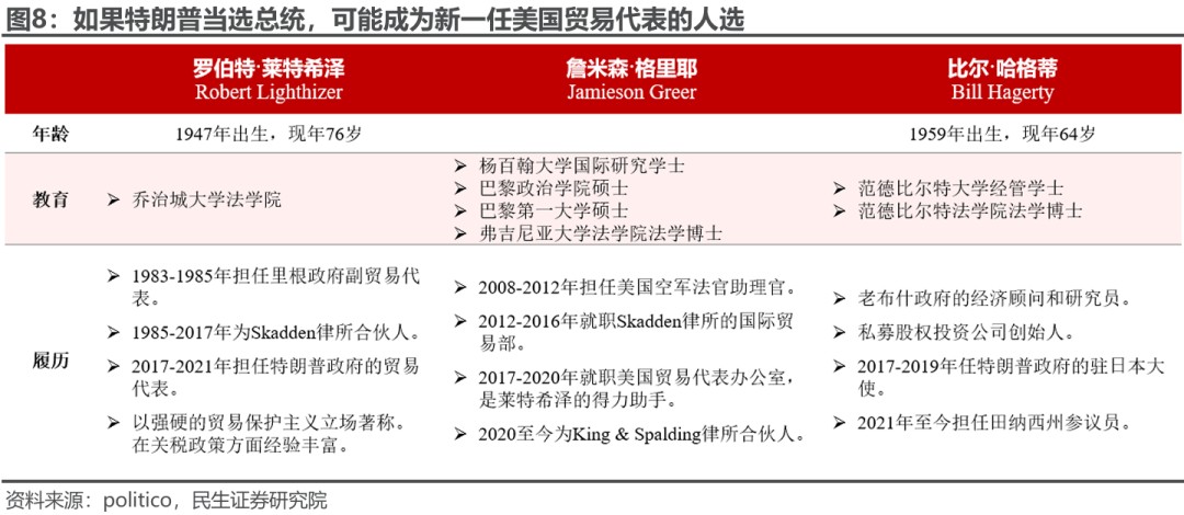 除了莱特希泽以外,可能被提名贸易代表的候选人有:詹米森·格里耶、比尔·哈格蒂。格里耶在特朗普第一任期内就职于贸易代表办公室,是莱特希泽的得力助手,继承莱特希泽的政策理念。哈格蒂是老布什政府的资深人士,共和党建制派,曾任特朗普第一任期的驻日本大使并受好评,在任期内大力推动日美贸易协定和 WTO 改革,现任田纳西州参议员。