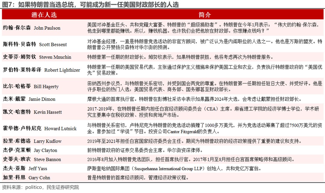 新一届财长的人选,将决定明年如何解决 “债务上限” 问题、如何延续减税和放松监管,目前约翰·保尔森、斯科特·贝森特的呼声较高;而贸易代表则决定了未来 4 年美国关税的策略和步奏,莱特希泽的意见会很重要。