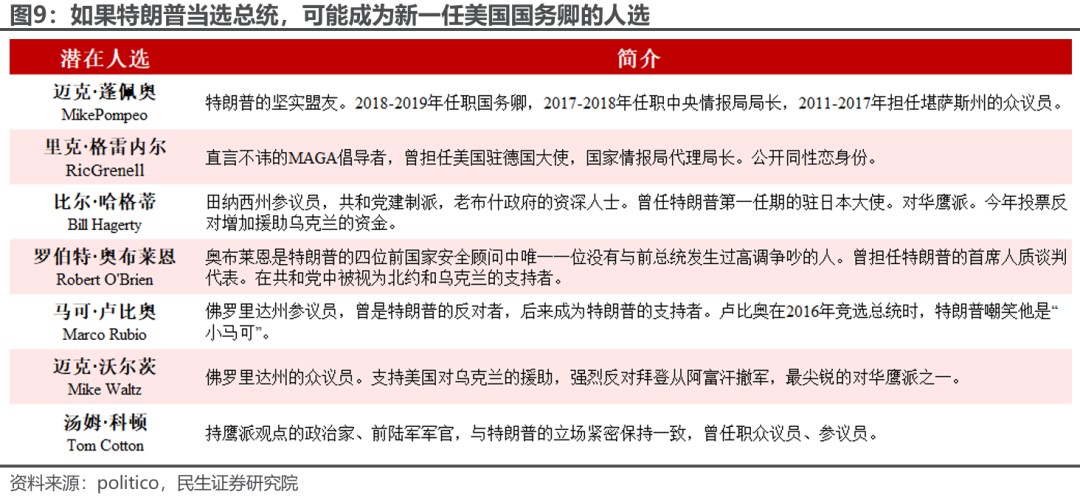 2025 年的国务卿人选备受瞩目,将关系到俄乌冲突、北约、以色列等问题的动向。若特朗普赢得大选,蓬佩奥仍将是有力的竞争者,其他可能的竞争者如图 9,图中列出的潜在候选人除了竞争国务卿以外,也可能竞争国家安全相关的其他高级职位,例如国防部长、中央情报局局长、国家安全顾问等。