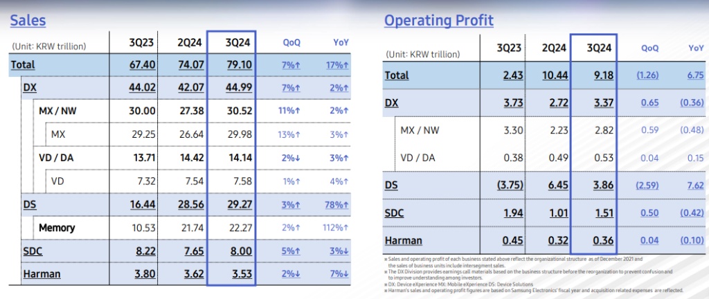 芯片部门(DS):DS 部门三季度的合并收入同比增长 112% 至 29.27 万亿韩元,不及市场预期的 30.53 万亿韩元。营业利润为 3.86 万亿韩元,去年同期为-3.75 万亿韩元。