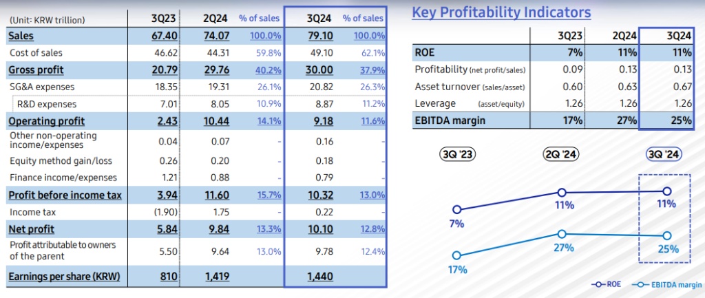利润:三星电子 Q3 毛利润为 30 万亿韩元,去年同期为 20.79 万亿韩元,净利润同比大幅增长 72.9% 至 10.1 万亿韩元,营业利润由上季度的 10.44 万亿韩元下降至 9.18 万亿韩元,虽高于该公司月初发布的盈利指引,但不及市场预期的 9.14 万亿韩元。