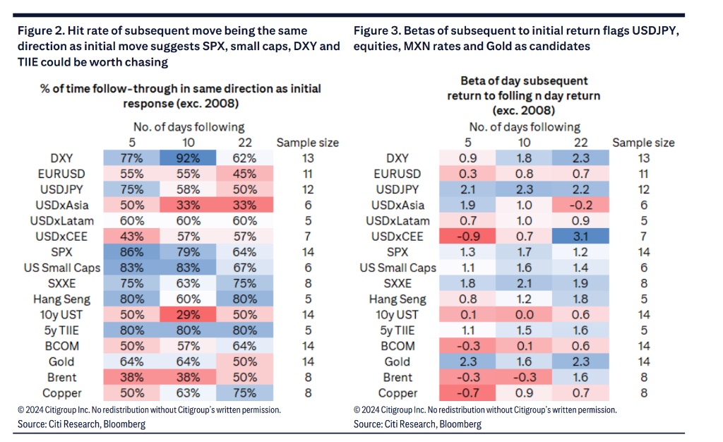 花旗指出,市场已经部分定价了特朗普胜选的可能性,这表明相关交易风险回报比已经恶化。分析显示,投资者如果在选举结果出炉后,顺应行情走势做出投资决策,往往能够获得正面的回报,尤其是在标普 500 指数和美元指数上。花旗保持对美股的超配立场。