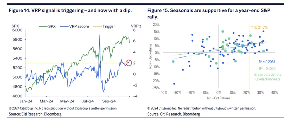 花旗通过 VRP 信号发现,市场可能战术性超卖,表明市场可能过度反应了选举的不确定性。他们认为,尽管选举前市场存在不确定性,但市场显示出 “过于恐惧” 的迹象,并可能在选举结果积极时反弹。此外,季节性因素也支持市场在年底前反弹,花旗因此保持对美国股票的超配立场。