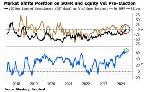 美东时间 11 月 4 日周一彭博宏观策略师 Simon White 指出,大选前,投机者对短期美国利率的净多头仓位和 VIX 的净空头仓位发生逆转,即短期利率变为净空仓,VIX 变为净多仓。同时市场仍持有股票和债券的多仓,并开始大举做多白银。