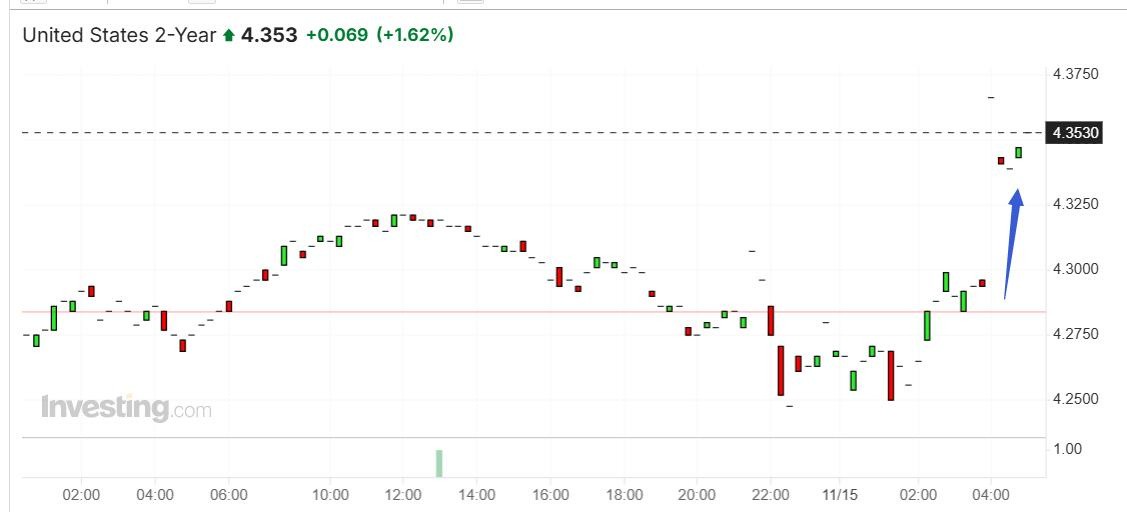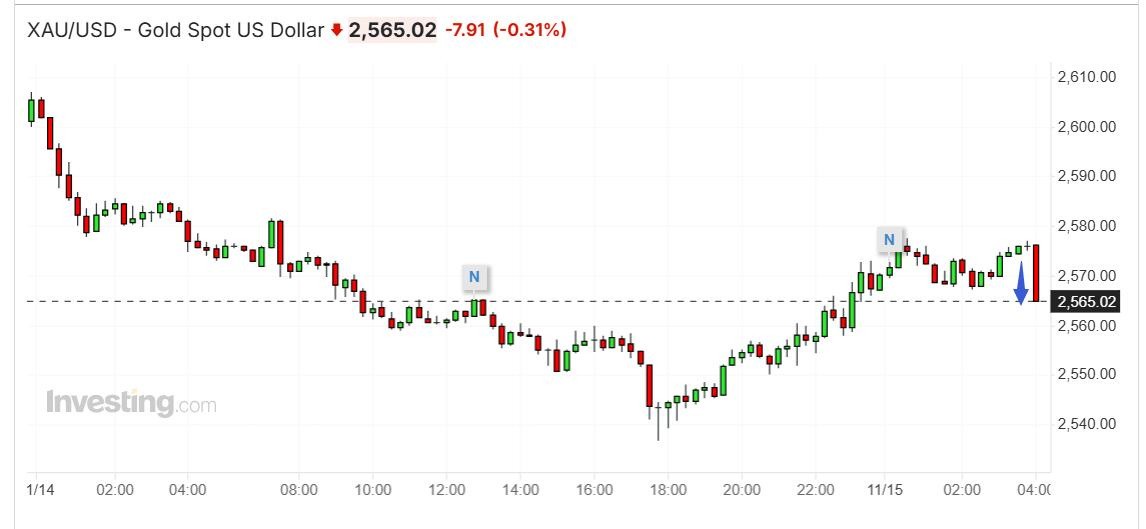 鲍威尔表示不急于降息后,对利率前景敏感的两年期美国国债收益率短线上扬 3 个基点,逼近 4.32%,美股尾盘一度上测 4.37%。美股午盘小幅转涨逾 0.1% 的现货黄金短线下挫大约 6 美元,至 2570 美元一线,日内重新转跌。美元指数涨幅扩大。