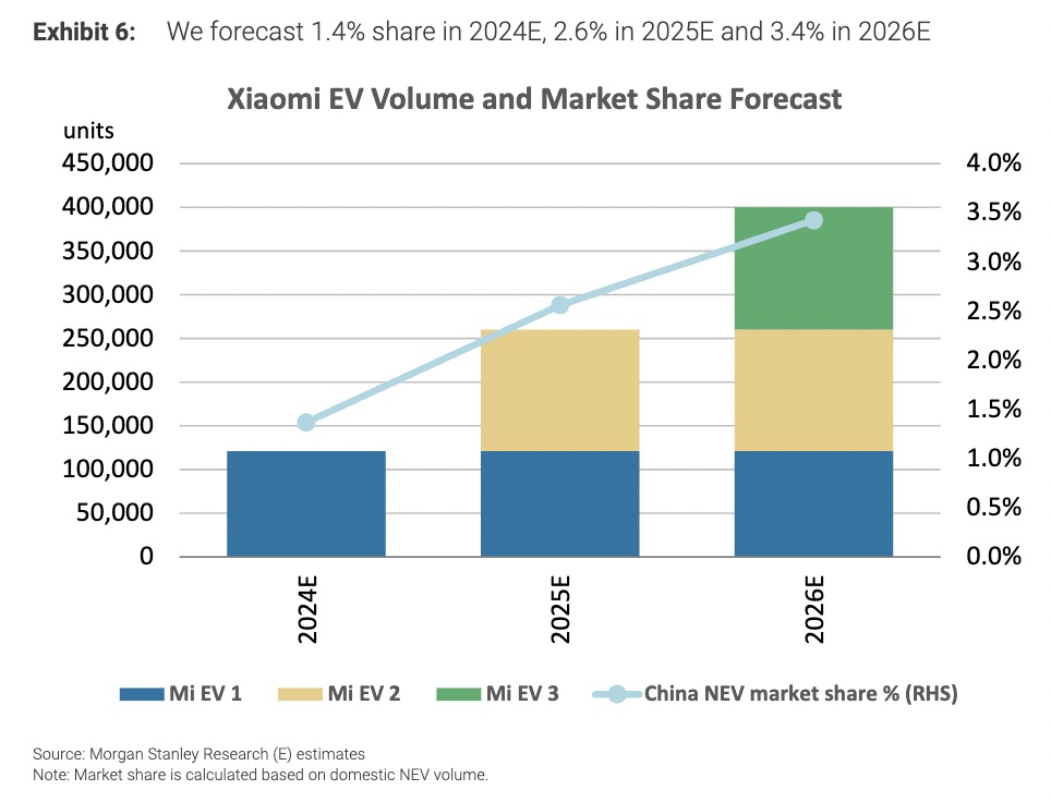 预计到第二款电动 SUV 推出后,小米在电动汽车的市场份额将在 2025 年达到 2.6%、在 2026 年达到 3.4%。