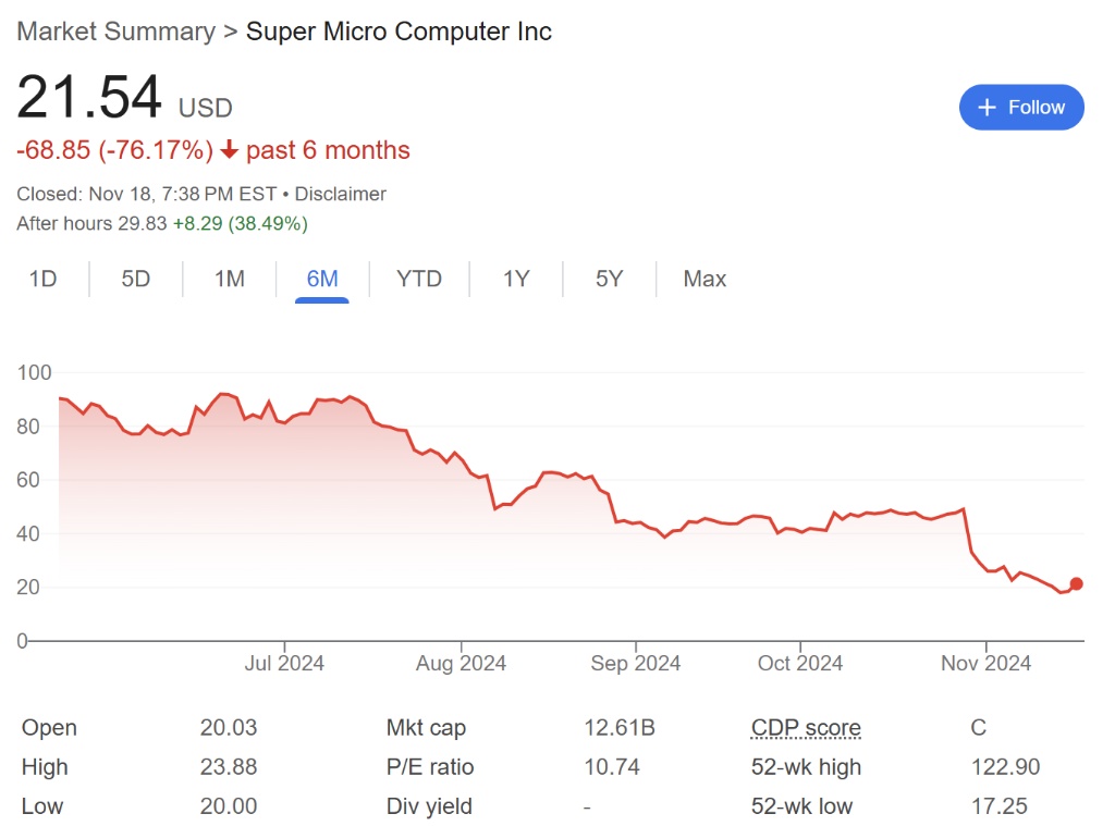 2022 年初至 2024 年 3 月的两年间,超微电脑的股价飙升超过 20 倍,但由于出现合规性问题,股价遭遇重创,过去 6 个月跌超 76%。