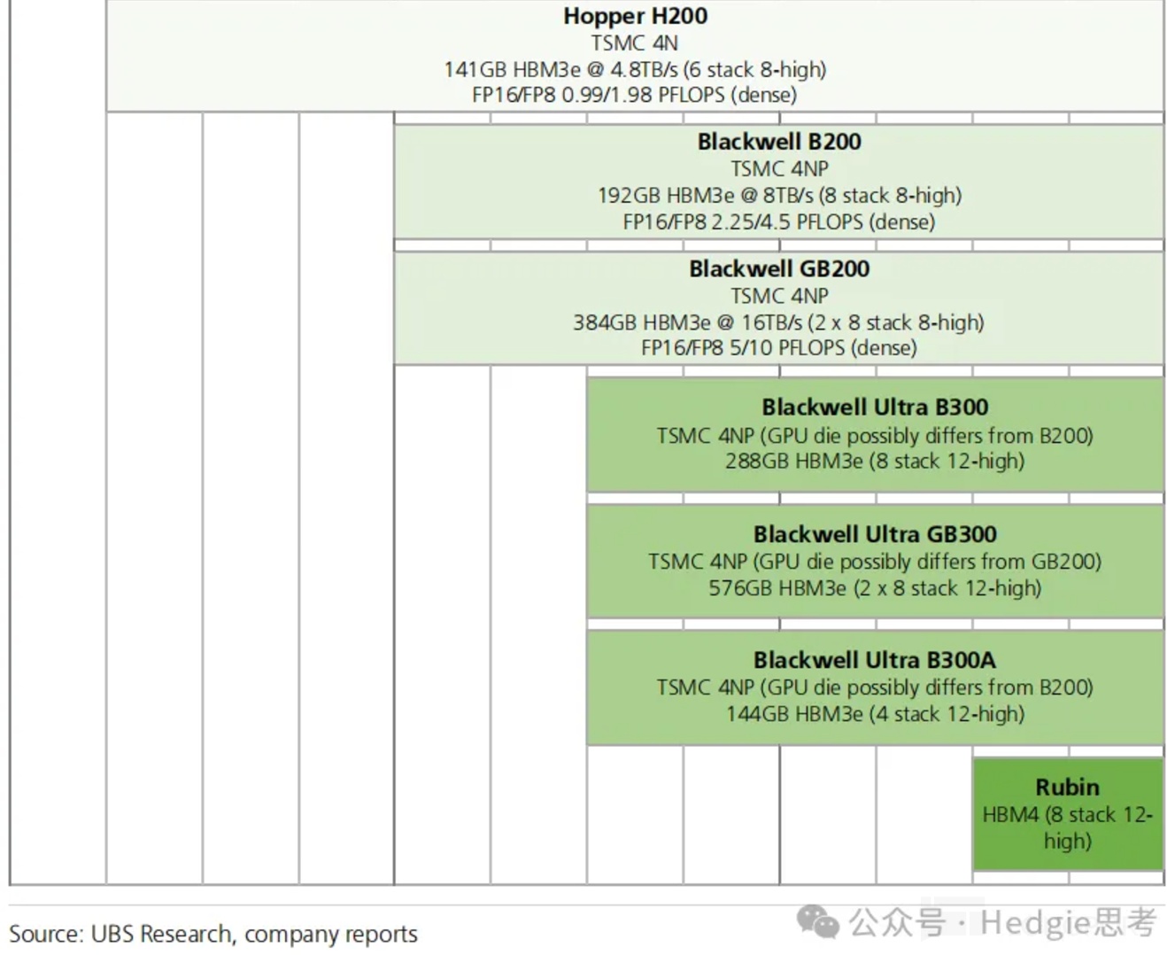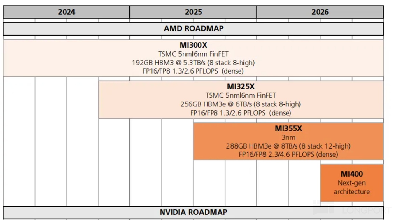 GPU 产品路线图:NVIDIA 和 AMD 的数据中心 GPU 产品路线图显示了 NVIDIA 在技术创新方面的领先地位。(下图)