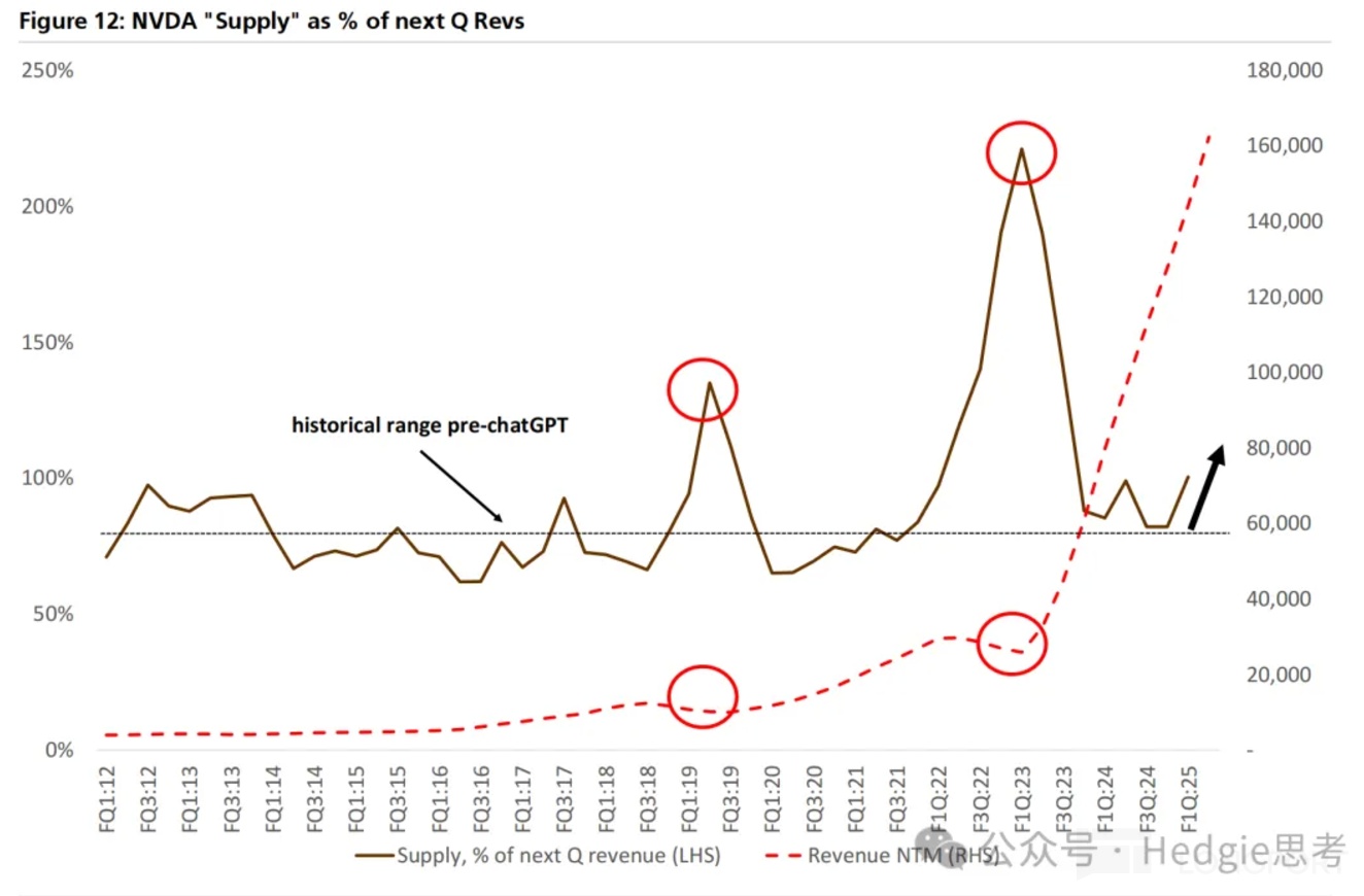 产能预期提高:UBS 用英伟达本季存货叠加下一季的营收做了相关性分析。结果如下图(一条红线起飞,具体计算逻辑就不贴了)