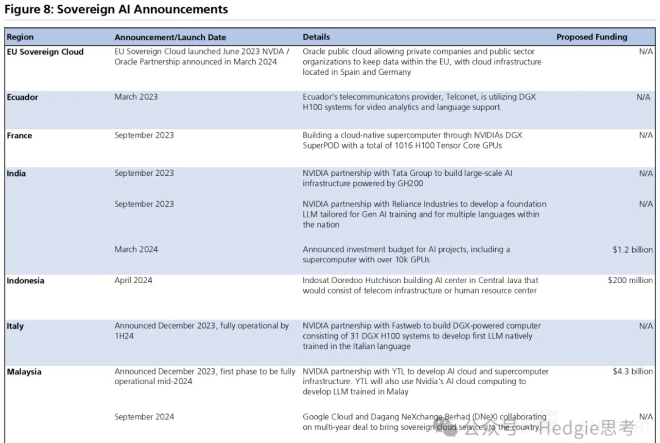 主权 AI 投资增长:主权 AI 已成为 NVIDIA 的一个重要需求驱动因素,预计 2024 年相关收入已超过 100 亿美元,这反映了全球对 AI 技术的投资趋势。