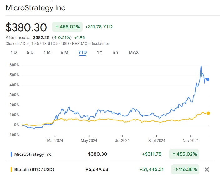 随着特朗普当选,比特币一飞冲天,有美股 “最大比特币代理” 之称的 MicroStrategy(MSTR)涨势更加迅猛。自美国大选以来,比特币上涨近 40%,MicroStrategy 上涨 67%;年初以来,MicroStrategy 涨幅高达 455%,是比特币同期涨幅的将近 4 倍!