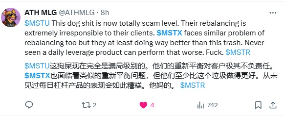 这种情况也发生在 MSTX 上,社交媒体上对这两只 ETF 怨声载道,网友吐槽:数学失灵了。