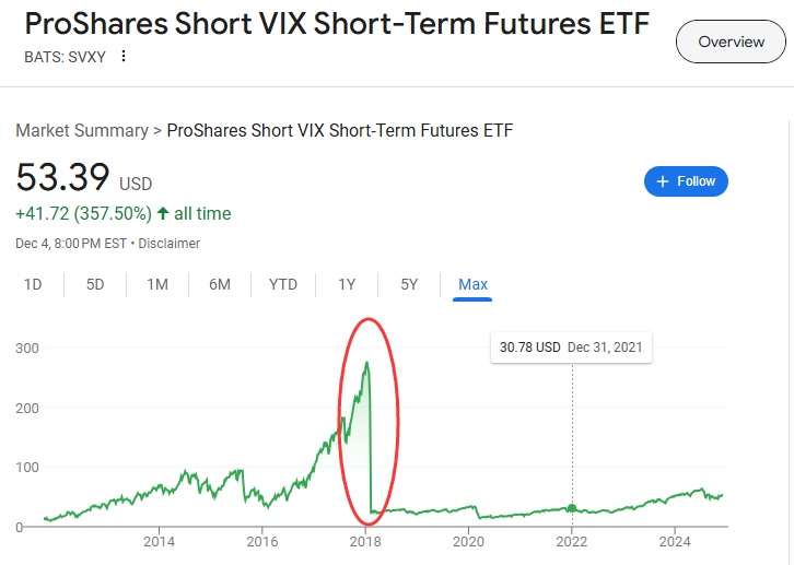 其中 XIV 在单日暴跌 96%,几乎完全丧失了价值。随后,XIV 的发行方瑞士信贷宣布清盘该 ETF,持有该产品的投资者几乎损失了全部投资。SVXY 虽然没有遭到清盘,但也从此一蹶不振。