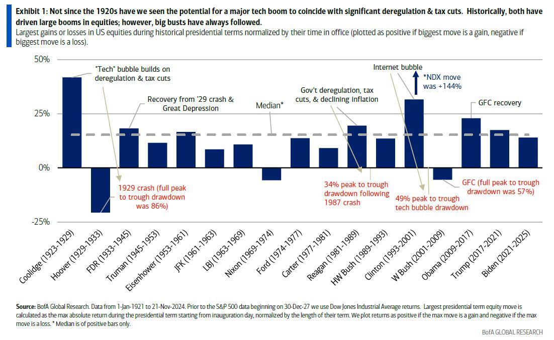 美银展望 2025:美国百年来最激进政策将助长 “科技泡沫”,但 “爬得越高摔得越狠”