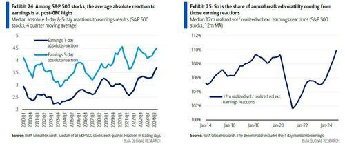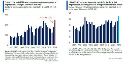 更重要的是,美股单只股票的脆弱性也在上升,现在频率和幅度都接近三十年来的极端水平。脆弱性通常在财报公布前后飙升。